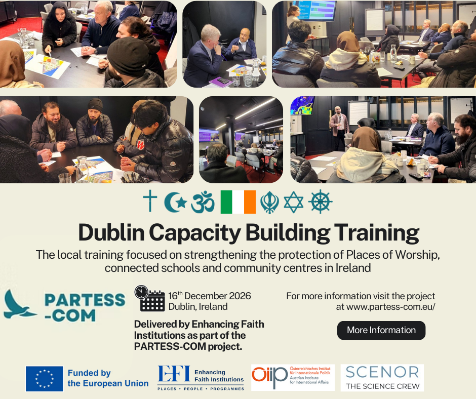 Faith communities across Europe continue to play a vital role in social cohesion, support, and cultural identity. Yet, in recent years, we have seen an increase in security challenges linked to violent extremism and targeted threats. To help address these concerns, a one‑day capacity‑building training programme was organised and delivered by Enhancing Faith Institutions in in Dublin as part of the EU‑funded PARTESS‑COM Project.